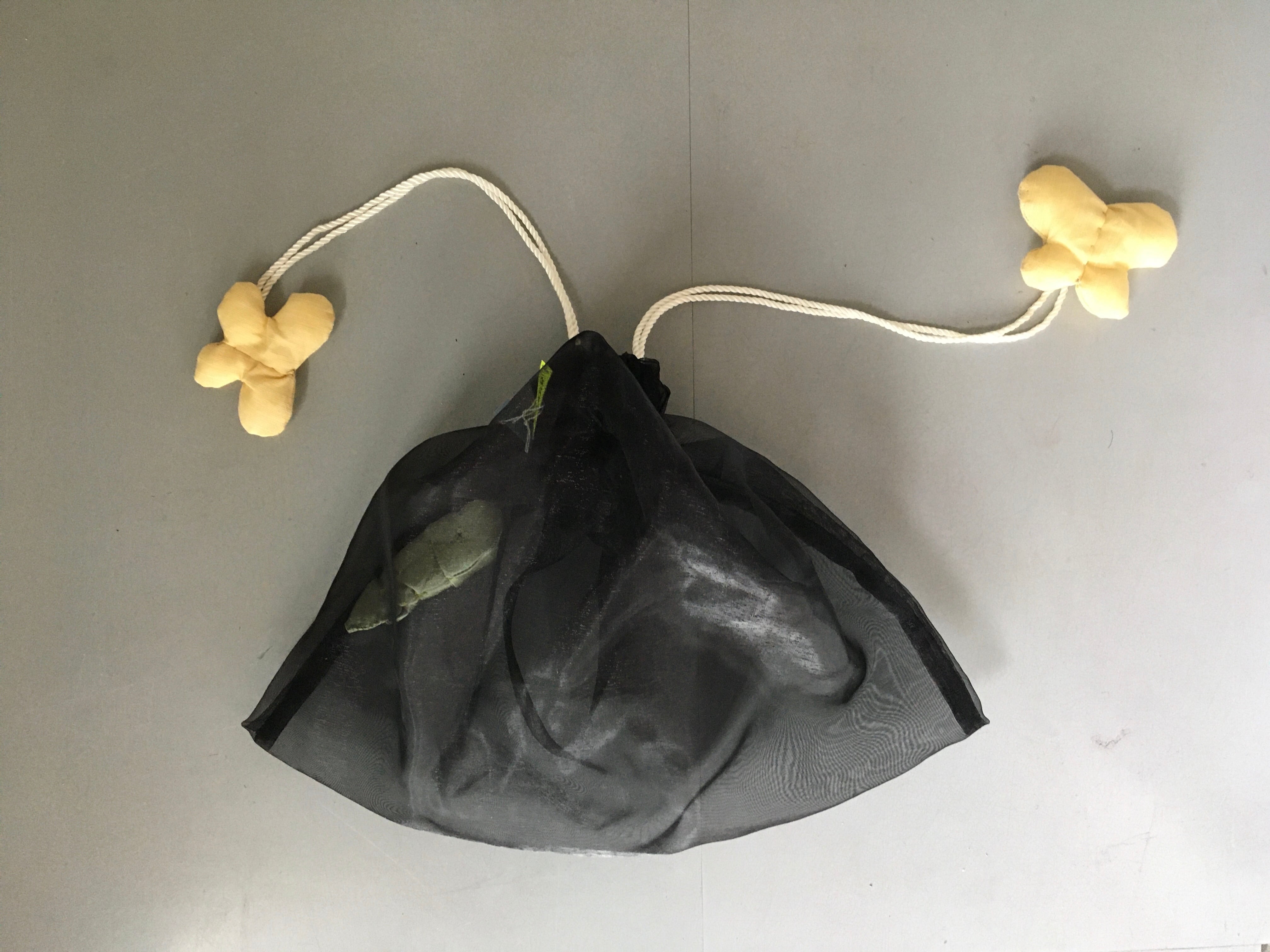 モチーフはちょうちょと、ふくろのなかに青虫。